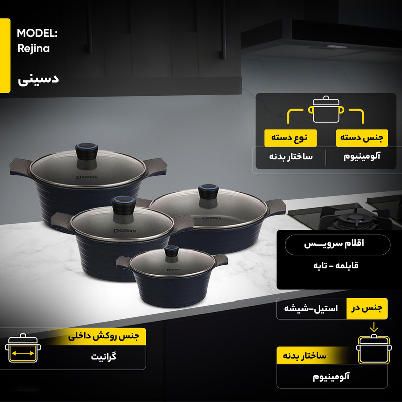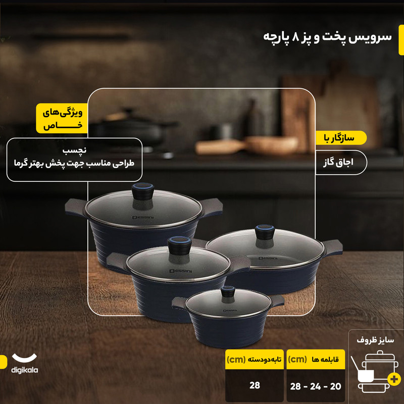 وزن ظروف: قابلمه سایز ۲۸: ۱۹۸۰ گرم، قابلمه سایز ۲۴: ۱۵۸۵ گرم، قابلمه سایز ۲۰: ۹۴۵ گرم، تابه سایز ۲۸: ۱۹۱۰ گرم