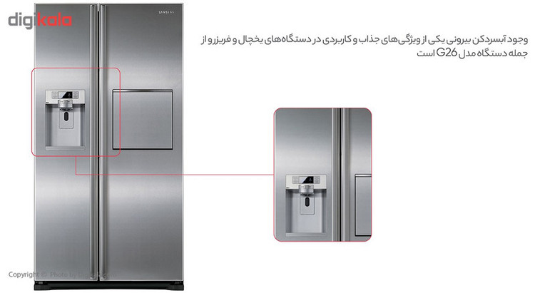 یخچالفریزر مدل «G26» از محصولات «سامسونگ»است که طراحی زیبا و کیفیت بالایی دارد و به رنگ سفید تولید و عرضه شده است. این یخچالفریزر که در ردیف یخچالفریزرهای سایدبایساید قرار میگیرد، از فناوری Twin Cooling Plus یا سیستم خنککنندهی دوگانه بهره میبرد که ضمن برخورداری از سیستم خنککننده، با رطوبت مناسب و تنظیمات مجزا برای هریک از بخشهای یخچال و فریزر باعث ماندگاری بیشتر موادغذایی میشود؛ همچنین ضمن کنترل رطوبت فریزر، نگرانیهای حاصل از نگهداری برخی موادغذایی نظیر ماهی و نان سیر را که ممکن است طعم و کیفیت دیگر مواد را نیز تحت تأثیر قرار دهند، رفع میکند. بهرهمندی از کمپرسور اینورتر هم مزایای قابلتوجهی نسبت به مدلهای قدیمیتر دارد که عبارت است از کاهش قابلتوجه مصرف برق، کاهش استهلاک و افزایش طول عمر دستگاه، کاهش صدای تولیدی و افزایش ماندگاری مواد غذایی. یخچالفریزر سامسونگ G26 از آبسردکن و یخساز خودکار بیرونی نیز بهره میبرد که به کارایی و جذابیت این محصول میافزاید. محفظهی میوه و سبزیجات با انتخاب رطوبت خودکار (Moist Fresh Zone) از دیگر مشخصات بارز این مدل است که برای نگهداری مواد غذایی با ماندگاری بیشتر تعبیه شده است. جریان برودتی یکنواخت در طبقات نیز دیگر ویژگی G26 است که باز هم نشان از کیفیت عملکرد دستگاه دارد. در طراحی بدنهی این مدل هم از فناوری Space Max استفاده شده است تا بیشترین فضای داخلی برای مصرفکننده فراهم گردد. نمایشگر LED تعبیهشده روی درِ این یخچالفریزر هم از دیگر مشخصاتی است که ظاهر آن را زیباتر میسازد. محفظهی بار نیز برای این یخچال طراحی شده است که علاوهبر سهولت دسترسی به نوشیدنیهای پرمصرف، تأثیر زیادی هم در جلوگیری از اتلاف انرژی دارد. بهرهمندی از لایهی ضدباکتری Silver Nano، طبقات شیشهای مقاوم و ضدسرریز، فیلتر آب و بوگیر قوی از دیگر مشخصات این دستگاه محسوب میگردند که آن را برای بسیاری از مصرفکنندگان که قصد خرید یخچالفریزر سایدبایساید دارند، به گزینهای مطلوب تبدیل میسازد.