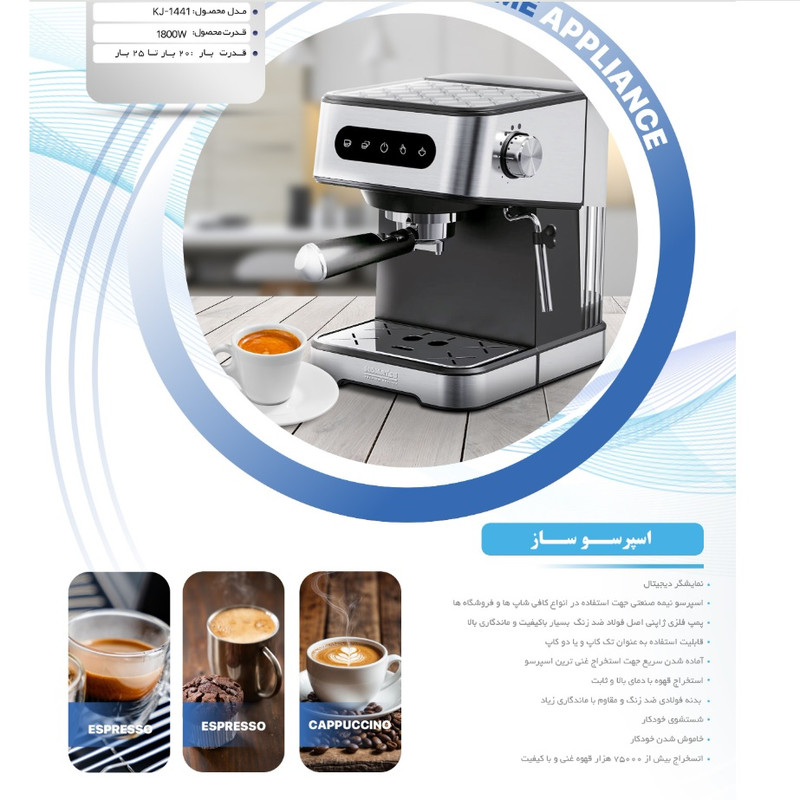 اسپرسوساز کوماتسو مدل 1441 یک دستگاه نیمه صنعتی با قدرت 1800 وات و فشار 20 بار است که برای استفاده در کافیشاپها و فروشگاهها طراحی شده است. این دستگاه مجهز به پمپ فلزی ژاپنی از جنس فولاد ضدزنگ با کیفیت و ماندگاری بالا میباشد که امکان استخراج غنیترین اسپرسو را فراهم میکند. اسپرسوساز کوماتسو مدل 1441 دارای نمایشگر دیجیتال بوده و قابلیت استفاده به صورت تککاپ یا دوکاپ را داراست. این محصول با توانایی گرمایش سریع و حفظ دمای ثابت، قهوهای با عطر و طعم مطلوب تولید میکند. بدنه فولادی ضدزنگ این دستگاه، مقاومت و دوام بالایی داشته و سیستم شستشوی خودکار و خاموش شدن خودکار آن، استفاده و نگهداری از دستگاه را آسان میسازد. این اسپرسوساز با ترکیب کیفیت ساخت بالا و عملکرد حرفهای، گزینهای ایدهآل برای کسبوکارهای مرتبط با قهوه محسوب میشود.