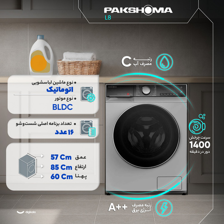 ماشین لباسشویی 8 کیلوگرم اتوماتیک پاکشوما مدل L8 یک انتخاب بهصرفه و مجهز برای خانوادههای متوسط است و با ظرفیت ۸ کیلوگرم، نیازهای شستوشوی روزانه، لباسهای حجیم و انواع پارچههای حساس را بهخوبی پوشش میدهد. موتور BLDC با عملکرد آرام و صدای ۵۴ دسیبل، مصرف انرژی کمصداتر و پایدار را فراهم میکند و با رده انرژی A++ و رده مصرف آب C تعادل مناسبی میان کارایی و مصرف ایجاد شده است. سرعت چرخش ۱۴۰۰ دور در دقیقه نیز باعث آبگیری مؤثرتر شده و زمان خشکشدن لباسها را کاهش میدهد. طراحی درب از جلو، بدنه آلومینیومی و دیگ استیل ضدزنگ الماسه از نظر دوام و محافظت از الیاف، عملکردی قابل اتکا ارائه میدهد.