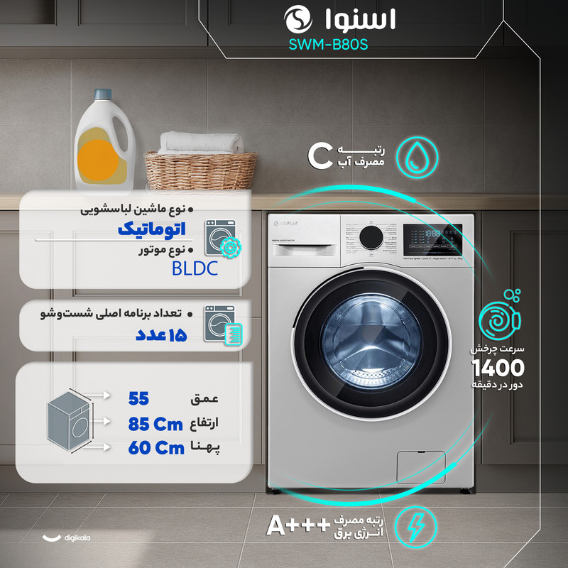 ماشین لباسشویی اسنوا مدل SWM-B80S یکی از محصولات باکیفیت و کارآمد این برند ایرانی است که با ظرفیت ۸ کیلوگرم، گزینهای مناسب برای خانوادههای متوسط و پرجمعیت محسوب میشود. این مدل با بهرهگیری از موتور اینورتر دیجیتال عملکردی بهینه، مصرف انرژی کم و صدای بسیار پایین دارد. برچسب انرژی A+++ نشاندهنده مصرف کم برق و آب در این مدل است که آن را در دسته لوازم خانگی اقتصادی و مقرون به صرفه قرار میدهد. این لباسشویی با طراحی زیبا و مدرن، دارای درب از جلو است که با زاویه ۱۵۰ درجه باز میشود و امکان بارگیری و تخلیه لباسها را به راحتی فراهم میکند. این مدل دارای ۱۵ برنامه شستوشو است که شامل شستوشوی سریع ۱۵ دقیقهای، شستوشوی لباسهای نخی، پنبهای، پشمی، کاموایی، حریر و ظریف، الیاف مصنوعی، لباسهای تیره، روتختی و تکههای بزرگ، شستوشوی انواع لباسها و برنامه شستوشوی قوی میشود. همچنین، وجود سیستم بخارشوی، باعث تمیزی عمیقتر لباسها میشودو میزان چین و چروک را کاهش میدهد. از دیگر ویژگیهای مهم این مدل میتوان به قفل کودک برای جلوگیری از تغییر تنظیمات، سیستم تمیز کننده خودکار جهت جلوگیری از تجمع باکتریها، سیستم عیبیاب خودکار برای نمایش مشکلات احتمالی و سیستم ضد چروک اشاره کرد. موتور اینورتر دیجیتال باعث کاهش صدای دستگاه به ۴۸ دسیبل شده است که آن را به یکی از لباسشوییهای کمصدای بازار تبدیل میکند. این مدل با داشتن دور خشککن قابل تنظیم تا ۱۴۰۰ دور در دقیقه، لباسها را با کمترین میزان رطوبت تحویل میدهد. همچنین، وجود برنامه صرفهجویی در مصرف انرژی به کاهش مصرف برق و آب کمک میکند. در مجموع، ماشین لباسشویی اسنوا مدل SWM-B80S یک گزینه مدرن، کم مصرف و کاربردی برای خانوادههایی است که به دنبال یک لباسشویی با امکانات هوشمند و شستوشوی بهینه هستند.