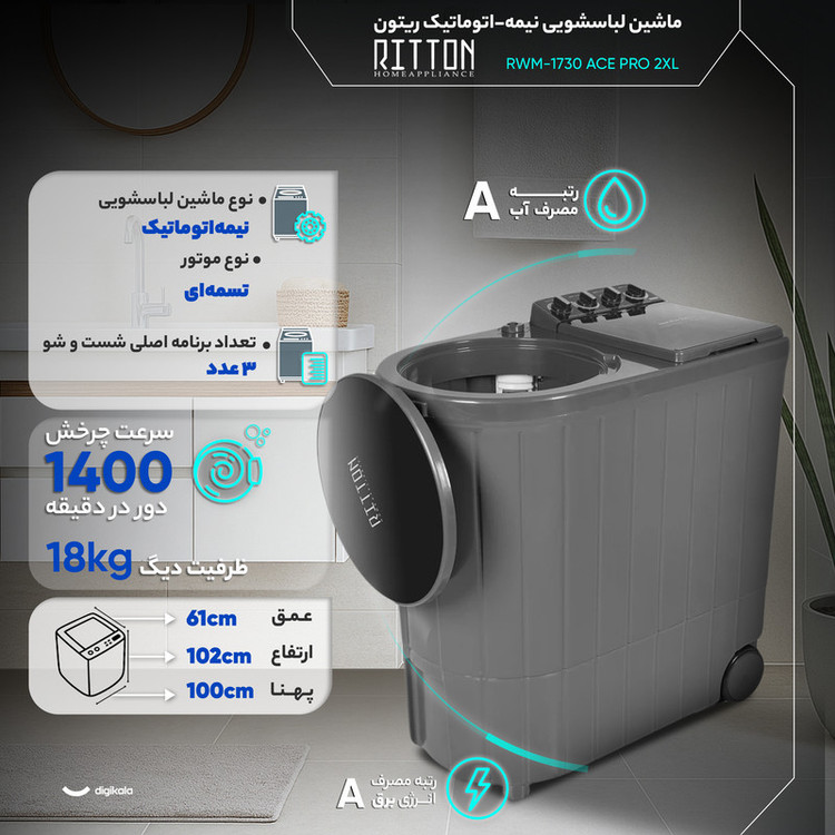 ماشین لباسشویی 18 کیلوگرم نیمهاتوماتیک ریتون مدل RWM-1730 ACE PRO 2XL
