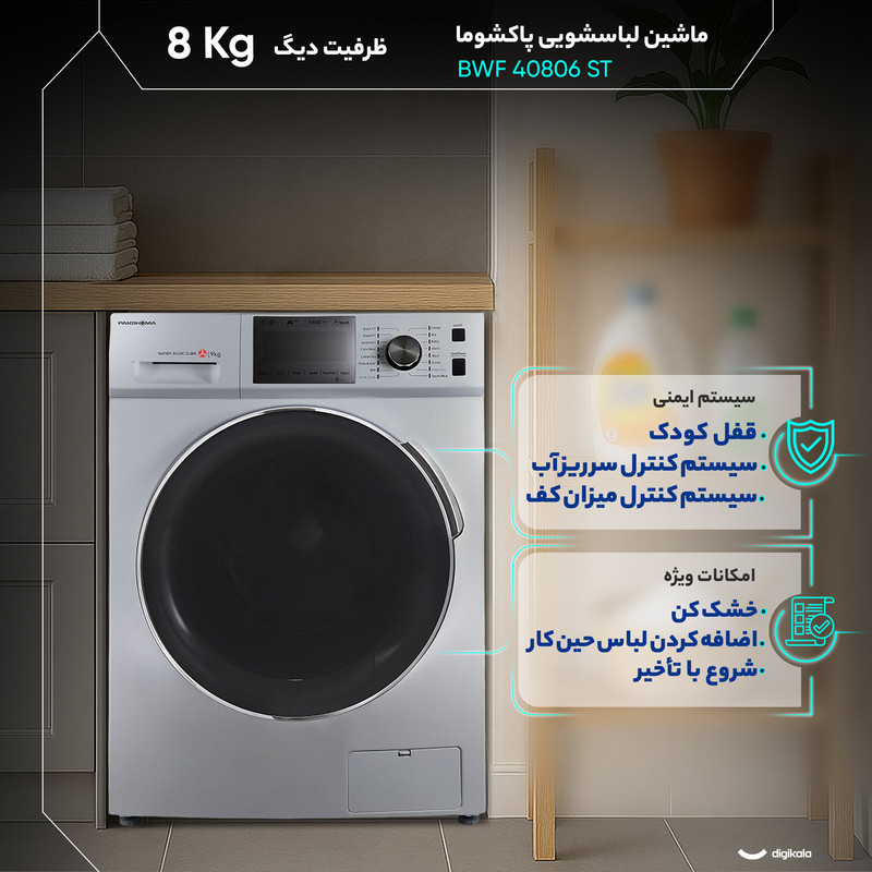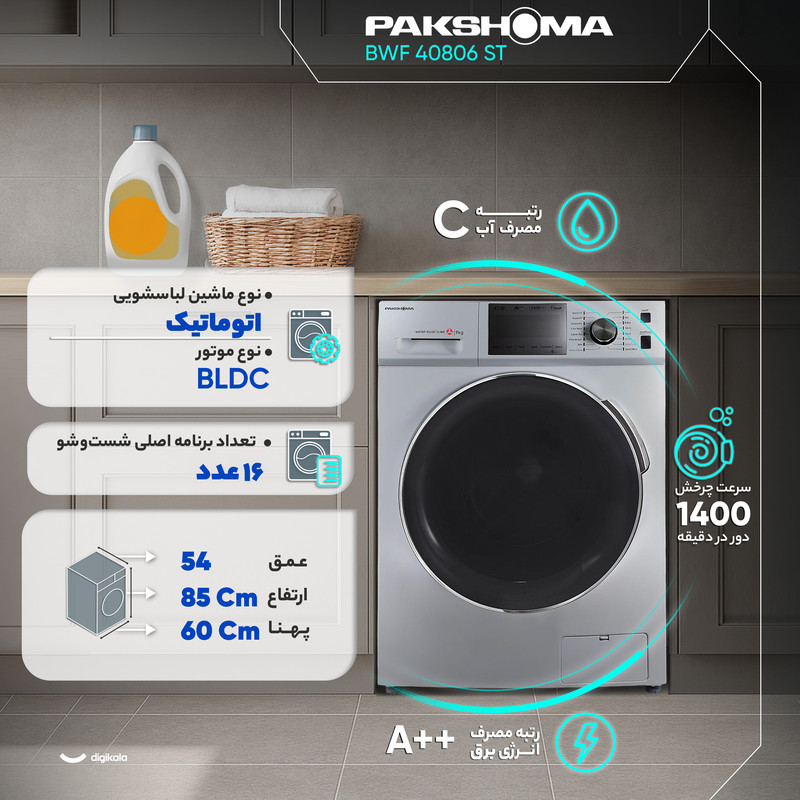 ماشین لباسشویی ۸ کیلوگرمی پاکشوما مدل BWF 40806 ST با طراحی درب از جلو و بهرهگیری از موتور BLDC ساخته شده تا ترکیبی از مصرف انرژی پایین، صدای کمتر و دوام بالاتر ارائه دهد. موتور بدونذغال BLDC در مقایسه با موتورهای معمولی اصطکاک کمتری ایجاد میکند و به همین دلیل راندمان دستگاه افزایش یافته و سطح صدای ۵۴ دسیبل در هنگام شستوشو بهخوبی کنترل میشود. ظرفیت ۸ کیلوگرم برای استفاده مستمر در محیطهای خانگی مناسب است و سرعت چرخش دیگ برابر با ۱۴۰۰ دور در دقیقه موجب خشکشدن بهتر البسه در پایان چرخه میشود. جنس بدنه از آلومینیوم و جنس دیگ از استیل ضدزنگ انتخاب شده تا مقاومت در برابر رطوبت، مواد شوینده و نوسانات دما تضمین گردد. رده مصرف انرژی A++ و برخورداری از ورودی مستقل آب سرد و گرم باعث میشود مصرف انرژی کاهش پیدا کند و دستگاه در آبوهوای مختلف عملکرد پایداری ارائه دهد. این مدل ۱۶ برنامه اصلی و ۵ برنامه کمکی را در اختیار قرار میدهد و برنامههایی مانند شستوشوی سریع، شستوشوی اقتصادی، آبکشی و چرخش، شستوشوی با دمای بالا و شستوشوی ملایم برای پارچههای حساس امکان مدیریت انواع لباس را فراهم میکند. بیشترین دمای شستوشو ۹۰ درجه سانتیگراد است که برای ضدعفونی پارچهها مناسب است و دمای حداقل ۲۰ درجه سانتیگراد برای شستوشوی کممصرف طراحی شده است. قابلیتهایی مانند اضافهکردن لباس حین کار، شروع شستوشو با تأخیر، قفل کودک، سیستم کنترل میزان کف و سیستم جلوگیری از سرریز، کنترل دقیق فرآیند شستوشو را ممکن میسازند. نمایشگر دیجیتال وضعیت عملکرد را بهطور واضح نمایش میدهد و کنترلها بهصورت ترکیبی از دکمههای لمسی و کلید چرخشی طراحی شدهاند تا دسترسی به تنظیمات ساده و سریع باشد. ابعاد ۸۵×۶۰×۵۴ سانتیمتر سازگاری مناسبی با فضای کابینت و جایگاههای استاندارد نصب دارد و مجموعه این ویژگیها مدل BWF 40806 ST را به انتخابی کارآمد، کممصرف و قابلاتکا برای استفاده روزمره تبدیل میکند.