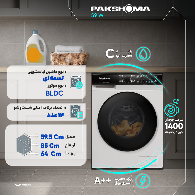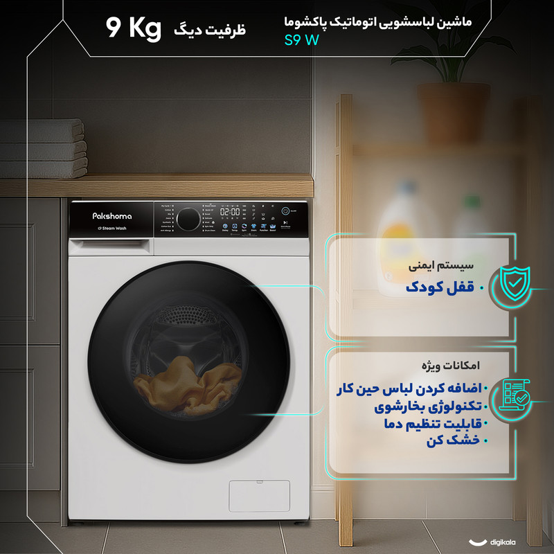 ماشین لباسشویی تمام اتوماتیک پاکشوما مدل S9 W با ظرفیت ۹ کیلوگرم، یک سامانه شستوشوی پیشرفته و کارآمد است که تجربهای نوین از پاکیزگی را برای خانوادهها به ارمغان میآورد. این دستگاه با دارا بودن موتور تسمهای از نوع BLDC، علاوه بر تضمین طول عمر بالا و عملکردی آرام، سرعت چرخش ۱۴۰۰ دور در دقیقه را در اختیار مصرفکننده قرار میدهد. چنین سرعتی موجب کاهش رطوبت باقیمانده در البسه و کوتاهتر شدن زمان خشک شدن آنها میشود.