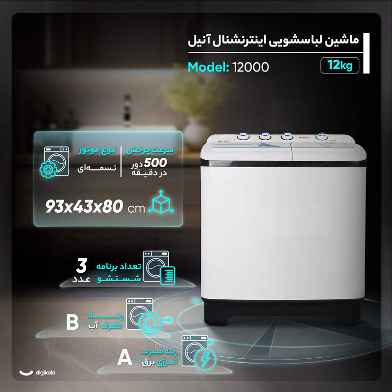 اگر به دنبال یک لباسشویی دوقلو با برند معتبر و کیفیت بالا هستید، لباسشویی دوقلو اینترنشنال آنیل مدل 12000 یکی از مناسبترین گزینهها برای شما است. این لباسشویی ظرفیت شستوشو 12 کیلوگرم لباس خشک را داراست که شامل بلوز، شلوار، کفش و پتو یک نفره میشود. سیستم شستشو آبشاری و پرزگیر این دستگاه از جدیدترین تکنولوژی روز بهره برده و لباس شما را تا 20 درصد تمیزتر از لباسشوییهای دیگر تمیز میکند. این لباسشویی دارای دو مخزن مجزا برای شستوشو و خشک کن بوده که همینطور قابلیت آبکشی اسلامی را نیز دارد. تایمر شستوشو و تایمر خشک کن به شما اجازه میدهد تا لباس را در حالت شستوشو و یا خشک کن گذاشته و به کارهای روزمره خود برسید. همینطور ورودی آب مخزنها مجزا بوده که راحتی بیشتر شما را به دنبال دارد. این لباسشویی با گرفتن تمامی استاندارهای کشوری و بین المللی یکی از پر طرفدارترین لباسشوییهای دوقلو محسوب میشود. این لباسشویی دارای لوله ورودی آب سرد و گرم بوده و قابلیت اضافه کردن لباس حین کار را دارد.