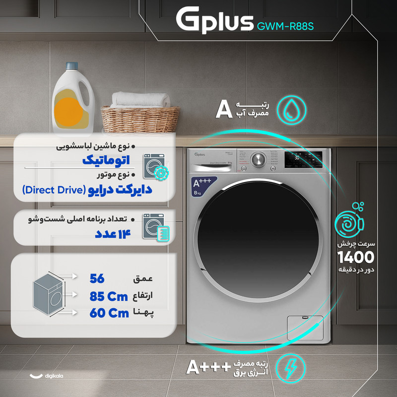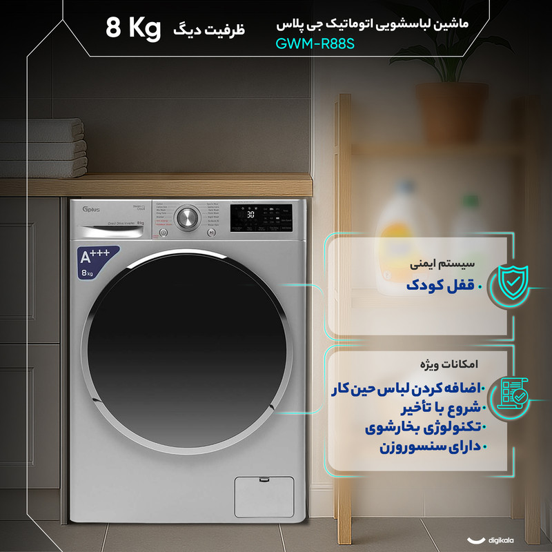 ماشین لباسشویی ۸ کیلوگرمی جیپلاس مدل GWM‑R88S با بهرهگیری از موتور دایرکتدرایو طراحی شده تا ترکیبی از دوام، لرزش کمتر و راندمان بالاتر فراهم کند. قرارگیری موتور بهصورت مستقیم بر محور دیگ موجب کاهش قطعات متحرک، کاهش اصطکاک و در نتیجه افزایش طول عمر دستگاه میشود و عملکردی کمصدا و پایدار ایجاد میکند. سرعت چرخش ۱۴۰۰ دور در دقیقه به خشکشدن بهتر لباسها کمک میکند و ظرفیت ۸ کیلوگرم این مدل را برای خانوادههایی با حجم متوسط شستوشو مناسب میسازد. دیگ از استیل ضدزنگ ساخته شده و به همراه حرکات کنترلشده موتور دایرکتدرایو از آسیب به الیاف جلوگیری میکند. بدنه آلومینیومی دستگاه مقاومت مطلوبی در برابر رطوبت و تغییرات دمای محیط ارائه میدهد و طراحی درب از جلو با بازشو به سمت چپ دسترسی مناسبی در هنگام بارگیری فراهم میکند. این مدل دارای ۱۴ برنامه اصلی و ۶ برنامه کمکی است و امکاناتی مانند برنامه مخصوص لباس کودک، حالت Night Wash با صدای کم، قابلیت ضدآلرژی و توانایی ازبینبردن لکهها تنوع بالایی در مدیریت چرخهها ایجاد میکنند. وجود تکنولوژی بخارشوی موجب نفوذ موثر رطوبت و گرما به بافت پارچه میشود و در فرآیند کاهش بو، آلودگی سطحی و چروکپذیری نقش مهمی دارد. سنسور وزن با تنظیم هوشمند میزان آب، زمان و شدت چرخش موجب بهینهسازی مصرف انرژی میشود و همین ویژگی همراه با رده مصرف انرژی A+++ و رده مصرف آب A بازده بالای دستگاه را تقویت میکند. قابلیتهایی مانند اضافهکردن لباس در حین کار، شروع با تأخیر و امکان تنظیم دمای آب و سرعت چرخش انعطاف گستردهای در شستوشو ایجاد میکنند. قفل کودک، سیستم کنترل میزان کف و امکان تشخیص اولیه خطاها جنبه ایمنی دستگاه را تکمیل میکنند. نمایشگر دیجیتال وضعیت چرخهها را شفاف نشان میدهد و کنترلها بهصورت ترکیبی از دکمههای لمسی و پیچ چرخشی طراحی شدهاند. ابعاد ۸۵×۶۰×۵۶ سانتیمتر نصب آسان در فضاهای استاندارد را فراهم میکند و مجموعه این قابلیتها مدل GWM‑R88S را به انتخابی کارآمد، کممصرف و پایدار برای استفاده روزمره تبدیل میکند.