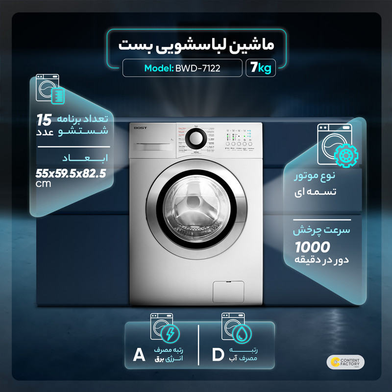 ماشین لباسشویی بست مدل BWD-7122 از جدیدترین محصولات گروه صنعتی انتخاب است که با ظرفیت 7 کیلوگرم طراحی و روانه بازار شده است. این لباسشویی از نوع درب از جلو است و پنل آن در قسمت جلو قرار گرفته است. این ماشین لباسشویی از 15 برنامه اصلی شستشو بهره می برد که از طریق پنل جلویی آن قابل انتخاب است؛ وجود برنامههای متنوع در ماشین لباسشویی به شما اجازه میدهد که برنامه شستشو را متناسب با نوع و جنس لباسها انتخاب کنید. همچنین می توان میزان دما را به صورت دستی انتخاب کرد. همچنین این محصول، از یک موتور قدرتمند با سرعت چرخش 1000 دور در دقیقه بهره میبرد که از کیفیت بالای شستوشو در آن میتوانید اطمینان حاصل کنید. یکی دیگر از ویژگی های این ماشین لباسشویی استفاده از بخارشوی است که بسیار کاربردی است. این محصول از گروه صنعتی انتخاب با داشتن برچسب انرژی A+++ از کالاهای اقتصادی با مصرف انرژی کم محسوب میشود.