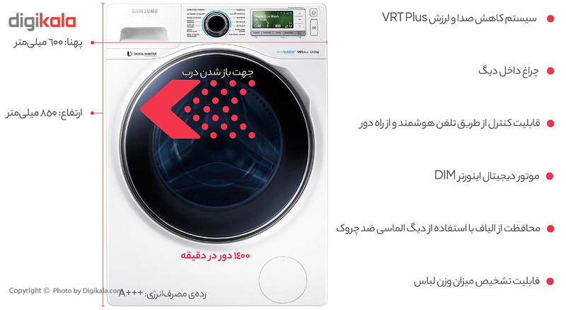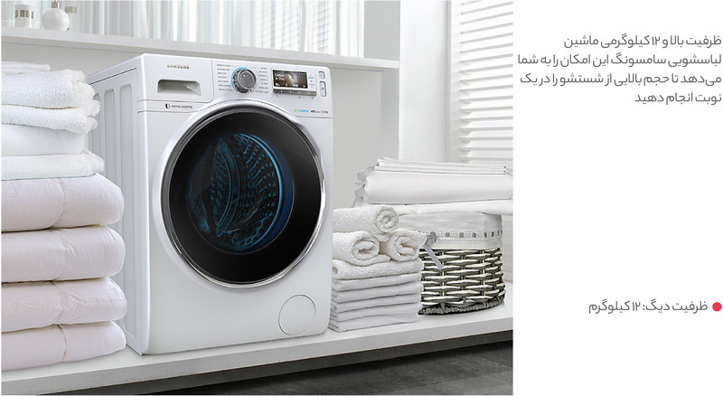 ماشین لباسشویی سامسونگ مدل H146 با ظرفیت 12 کیلوگرم ، یکی از لباسشوییهای شرکت سامسونگ است که ضمن از طراحی بسیار زیبا و مشخصات قابل توجهی از جمله ظرفیت مناسب و رتبه مصرف انرژی خوبی برخوردار است. این ماشین لباسشویی با ظرفیت 12 کیلوگرم میتواند در خانوادههای متوسط تا پرجمعیت مورداستفاده قرار گیرد. رتبه مصرف این دستگاه A+++ است و مصرف انرژی پایینی را خواهد داشت. سیستم کاهش صدا و لرزش VRT Plus از مزایای ویژه این محصول است. داخل دیگ در این مدل چراغ وجود دارد تا بتوان داخل ماشین را بهتر دید. از دیگر قابلیتهای این دستگاه دارای سیستم شستشوی چندحالته است که با وجود یک ولوم کنترلی Jog Dial که روی این دستگاه تعبیه شده است، کاربر میتواند به راحتی دستگاه را برای شستشوی البسه مورد نظر تنظیم و استفاده نماید. موتور دیجیتال اینورتر عملکرد دستگاه را به طرز چشمگیری بهبود بخشیده است. کاهش مصرف انرژی با استفاده از هیتر سرامیکی در سری جدید لباسشویی های سامسونگ انجام می شود. از دیگر مشخصات این دستگاه سیستم حفاظتی در نوسانات برق بوده که مانع از خرابی دستگاه می شود. محافظت از الیاف با استفاده از دیگ الماسه ضد چروک ممکن شده است. برنامه خودکار شستشوی دیگ لباسشویی نیز موجب میگردد مصرفکننده دیگر نگران تمیزی دیگ که شاید کیفیت شستشوها را نیز تحت تأثیر قرار دهد نباشد. سیستم عیب یابی هوشمند و پیش شستشو با کف هم در مدل H146 سامسونگ لحاظ شده است. این ماشین لباسشویی قابل کنترل از طریق تلفن هوشمند و از راه دور نیز هست که جز ویژگی های منحصر به فرد مدل H146 محسوب می شود. سامسونگ تولید و عرضه کننده محصولات با کیفیت در زمینه های مختلف از جمله لوازم خانگی برقی است. نوآوری، استفاده از مواد با کیفیت، قیمت مناسب و خدمات پس از فروش این شرکت، مخاطبین زیادی را به سمت خود کشانده و راضی نگه داشته است.