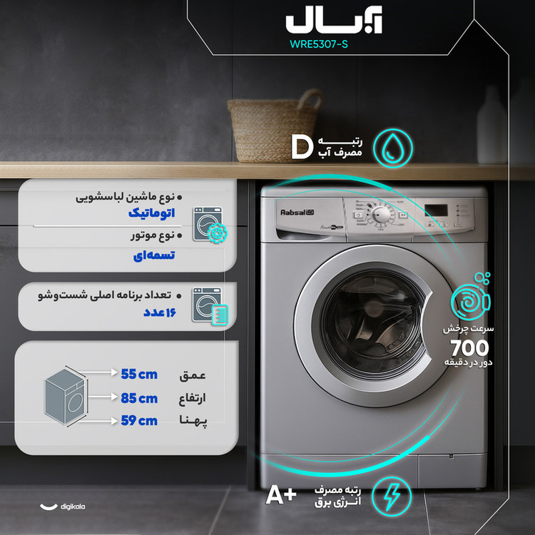 مدل WRE5307‑S یک ماشین لباسشویی اتوماتیک با ظرفیت اسمی ۵ کیلوگرم است که برای شستشوی حجم سبک تا متوسط طراحی شده. حجم مخزن، معادل ۱۲ تا ۱۵ قطعه لباس روزانه، امکان استفاده مؤثر در خانوادههای کمجمعیت یا کاربرانی با دفعات شستشوی بالا ولی حجم هر بار کم را فراهم میکند. موتور تسمهای با سرعت خشککن ۷۰۰ دور در دقیقه، چرخههای شستشو را با فشار مکانیکی ملایم اجرا میکند تا سایش الیاف در لباسهای ظریف کاهش یابد.