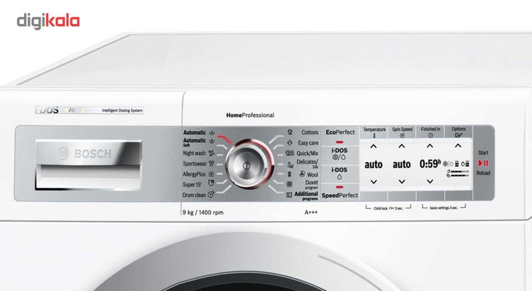 ماشین لباسشویی «بوش» مدل «WAY28862IR» یکی از محصولات قدرتمند و باکیفیت سری Home Professional بوش است. ظرفیت دیگ این دستگاه به نه کیلوگرم میرسد و از استیل مقاوم و ضدزنگ ساخته شده است. موتور پرقدرت دستگاه در حالت حداکثری با سرعت 1400 دور در دقیقه میچرخد. بوش برای لباسشویی مدل WAY28862IR خود 14 برنامهی متنوع شستوشو در نظر گرفته که شامل برنامههای پرکاربردی مثل شستوشوی سریع و برنامهی ضدآلرژی میشود. در حالت شستوشوی سریع، دستگاه تنها در 15 دقیقه سیکل شستوشو را به پایان میرساند. این قابلیت بیشتر برای نظافت لباسهای نیمهکثیف مناسب است. موتور لباسشویی از نوع EcoSilence Drive است و عملکردی کمصدا دارد. به علاوه کارکرد بهینهی موتور باعث شده این دستگاه بتواند رتبهی مصرف انرژی +++A را از آنِ خود کند. گفتنی است صدای لباسشویی در حالت عادی تا 49 دسیبل است و در وضعیت آبکشی تا 72 دسیبل بالا میرود. لباسشویی WAY28862IR بوش با قابلیت i-DOS میتواند به صورت خودکار میزان مواد شوینده و نرمکنندهی لازم برای شستوشوی بهینه را تخمین بزند. با وجود برنامهی شستوشوی دیگ، میتوانید به راحتی فضای داخلی دستگاه را تمیز کنید تا کیفیت شستوشو در طول زمان کاهش پیدا نکند. به علاوه فناوری VarioDrum که در این مدل به کار رفته است، شستوشوی ملایم البسه را تضمین میکند تا در طول زمان آسیب کمتری به بافت لباسها وارد شود. این مدل مجهز به قفل Aqua هم هست که از نشتی آب جلوگیری میکند.