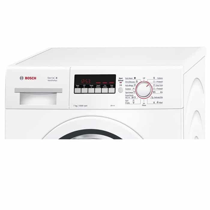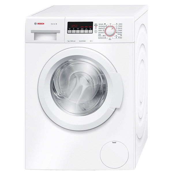 ماشین لباسشویی بوش BOSCH مدل WAK20200IR با رده انرژی +++A و ساخت کشور ترکیه ، جزء لباسشویی های کم مصرف و پر طرفدار شرکت بوش میباشد. لباسشویی 20200 دارای ظرفیت 7 کیلوگرم بوده که مناسب برای خانواده هایی با جمعیت متوسط میباشد. طراحی دیگ به صورت موجدار بوده که موجب شستشوی آرام و کارآمد البسه میشود. پنل این لباسشویی دارای نمایشگر دیجیتال ، کلید های تنظیم عملکرد و ولوم چرخشی برای تنظیم برنامه ی شستشو میباشد. برنامه های شستشو شامل شستشوی البسه تیره ، البسه ورزشی ، البسه بیرون ، الیاف نخی ، الیاف ظریف ، الیاف پشمی ، شستشوی ترکیبی ، پیش شستشو ، شستشوی سریع 15 تا 30 دقیقه ای و شستشوی ضد آلرژی میباشد. توسط کلید های تنظیم عملکرد نیز میتوان دمای آب ، میزان چرخش موتور در دقیقه ، VarioPerfect ، speedPerfect و عملکرد شروع با تاخیر را تنظیم نمود. از طریق قابلیت Vario Perfect میتوان متناسب با نوع لباس ، برنامه شستشو را انتخاب نمایید که موجب صرفه جویی 65 درصدی در زمان و 50 درصدی در مصرف انرژی میشود. در صورت فراموش نمودن افزودن لباسی برای شستشو یا بیرون آوردن لباس حین شستشو میتوانید از عملکرد توقف استفاده نمایید. در صورت باقیماندن کف روی البسه ، سنسور تشخیص کف ، شستشو و آبکشی ادامه می دهد. طراحی خاص دیواره دستگاه موجب کاهش صدا و از بین رفتن لرزش حین کار میشود. توسط ویژگی شروع با تاخیر نیز میتوان شستشوی البسه خود را از 1 تا 24 ساعت تنظیم نمایید. در این صورت حتی در زمان هایی که در منزل نیستید نیز میتوان دستگاه را روشن و البسه را شستشو نمود.