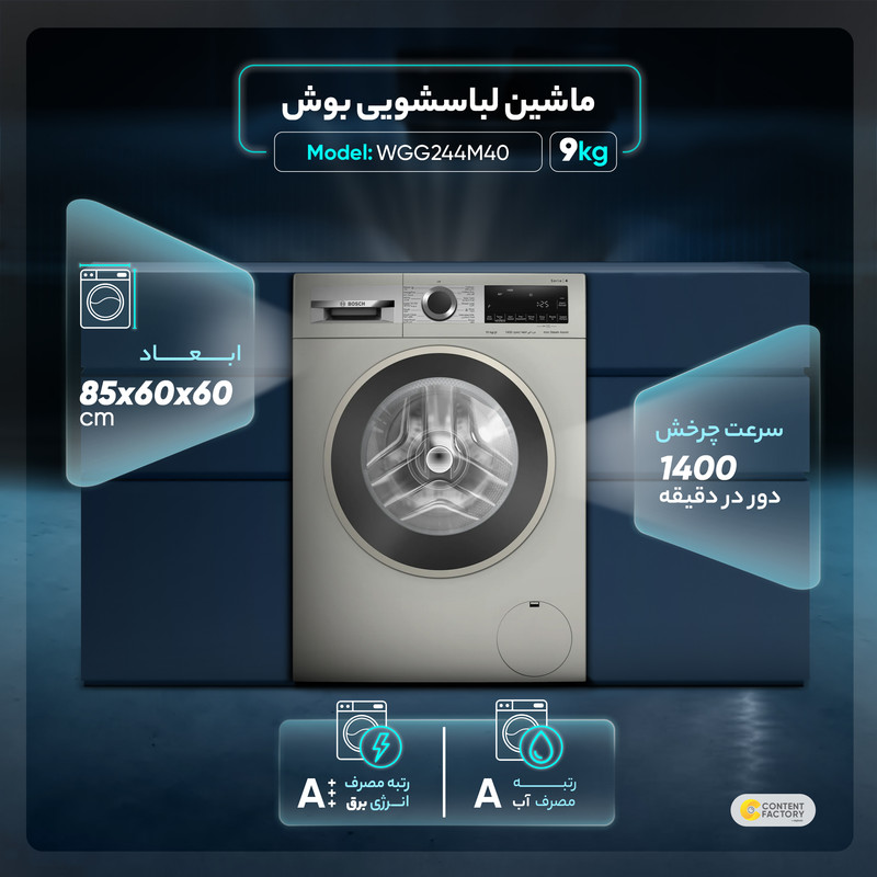 ماشین لباسشویی بوش مدل WGG244M40 یکی از بهترین ماشین های لباسشویی کمپانی بزرگ بوش آلمان است که به خاطر وجود قابلیت های متنوع و کیفیت بسیار عالی در شستوشوی انواع لباس ها مورد توجه و محبوبیت کاربران قرار گرفته است. ماشین لباسشویی بوش مدل WGG244M40 دارای حداکثر ظرفیت 9 کیلو گرم بوده که برای خانواده های پرجمعیت گزینه کاملا مناسبی به حساب می آید. موتوراین مدل ماشین لباسشویی بوش در هر دقیقه 1400 دور چرخش دارد که سبب تمیز و از بین بردن لکه های لباس ها میشود، همچنین میزان آب مصرفی در هر سیکل شستوشوی لباس ها 48 لیتر است.میزان صدای تولید شده در هنگان شستوشوی لباس ها 70 دسیبل است، وجود شیار هایی در اطراف و بدنه ماشین لباسشویی بوش مدل WGG244M40 علاوه بر زیبایی منحصر به فردی که به ماشین لباسشویی بخشیده قابلیت ضد لرزش و صدای کم را نیز دارد. ماشین لباسشویی بوش مدل WGG244M40 به رنگ سفید و همچنین وجود شیار هایی در اطراف بدنه لباسشویی برای کسانیکه علاقه مند به رنگ روشن هستند کاملا مناسب و مطابق سلیقه آن ها است